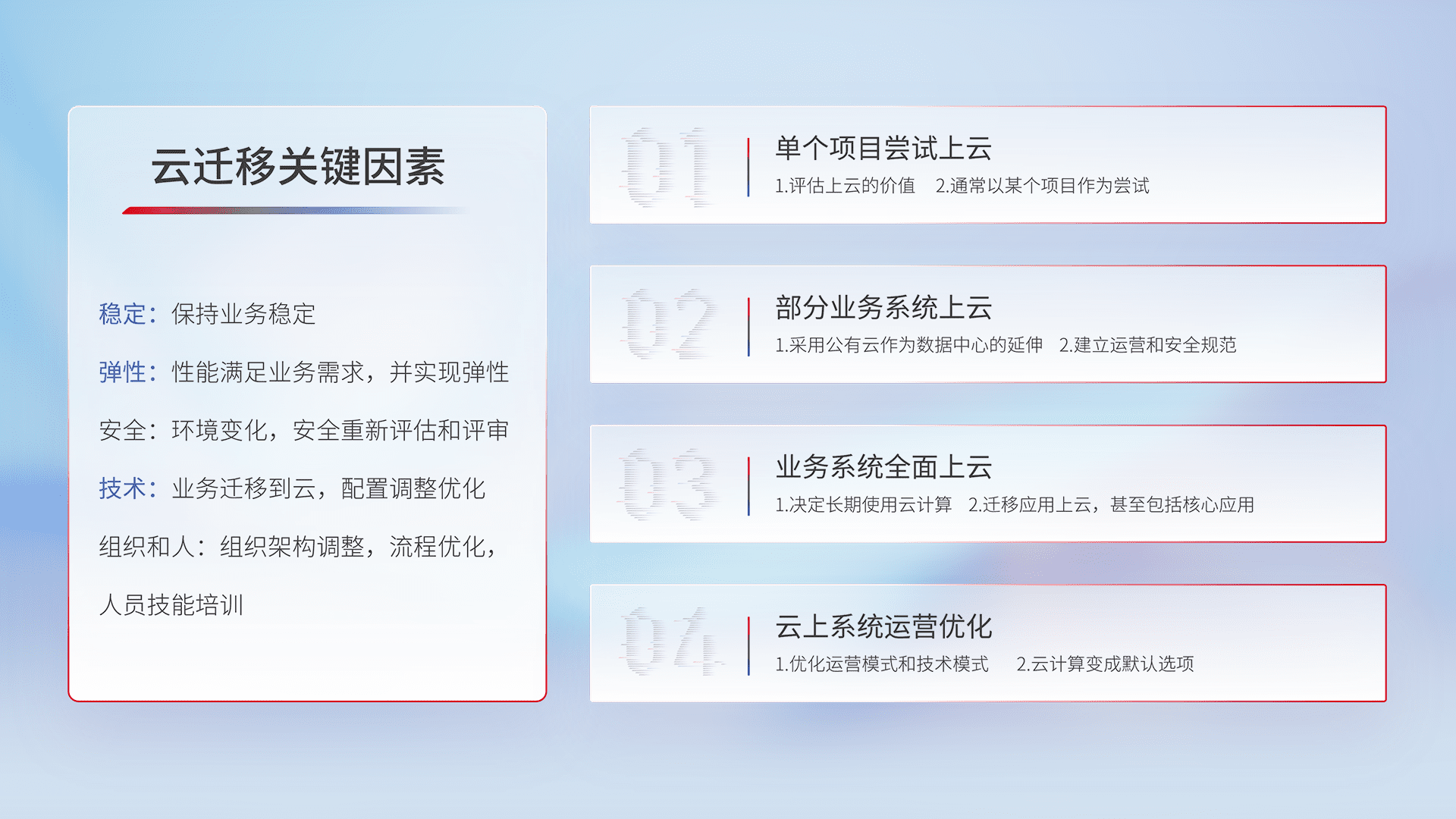 结合实际业务,,从规划设计、、、、云平台选型、、、、云原生改造、、、数据迁移、、、集成交付,,,,迁移全过程为客户识别最佳上云路径,,,,做好风险识别管理,,,设计网络架构、、、、身份权限、、、、安全审计合规、、、、操作审计、、、日志审计、、、、监控告警策略、、、多站点容灾设计等,,,,对云上基础设施进行整体规划,,,提升IT治理水平,,以满足弹性、、、、高可用、、、、高性能的需求。。。。