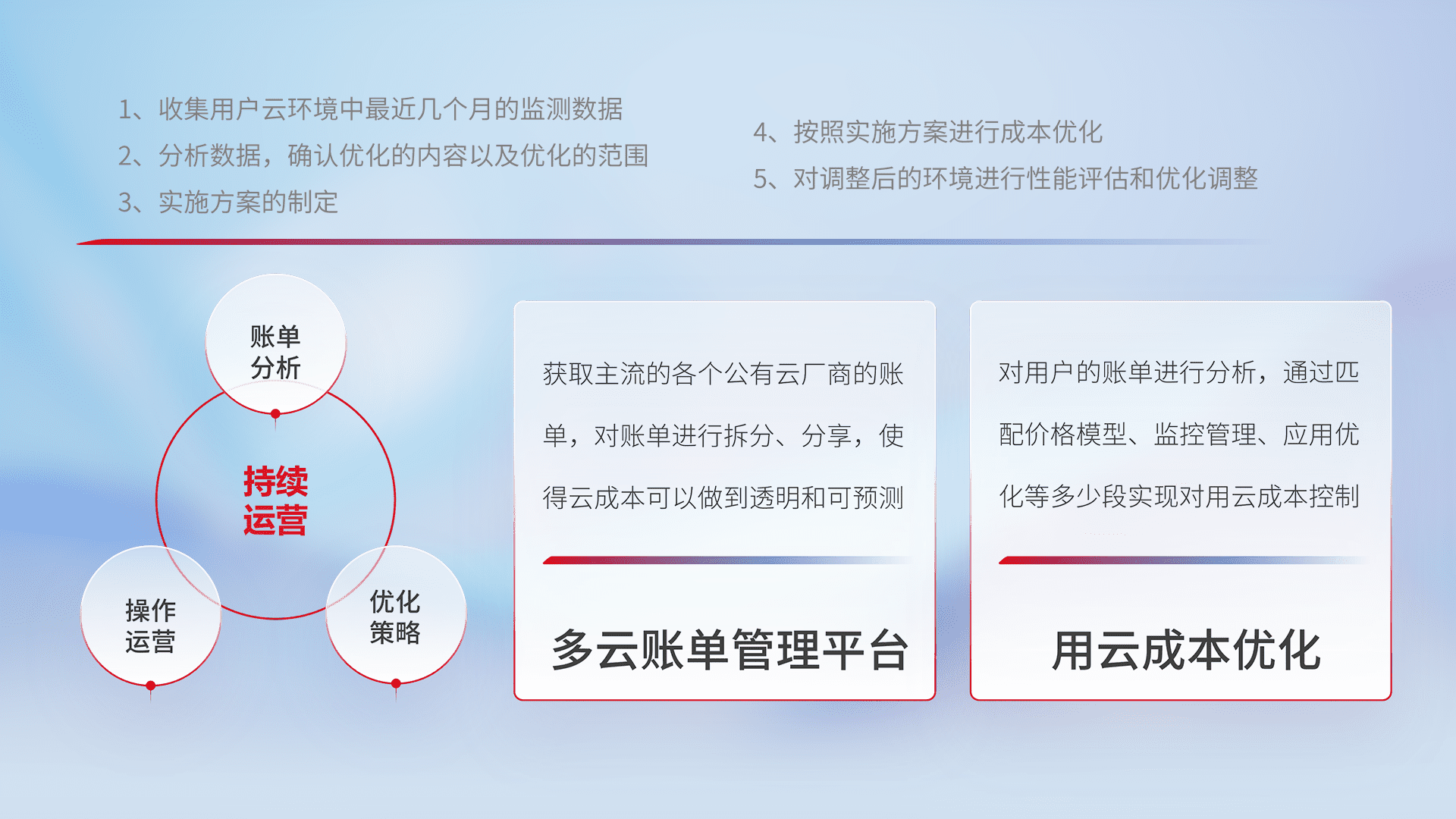 通过多云纳管,,,以统一的资源数据模型把客户的云资源进行抽象和封装,,,,进而实现对多云资源的统一操作,,保障云资源管理的可靠性、、、稳定性与可用性。。。量身定制化运维内容,,,配置、、开发运维、、补丁管理、、备份、、监控、、、认证和访问管理、、审计和日常巡检等,,保障在用云过程中的可靠度,,稳定度以及高可用率。。。。