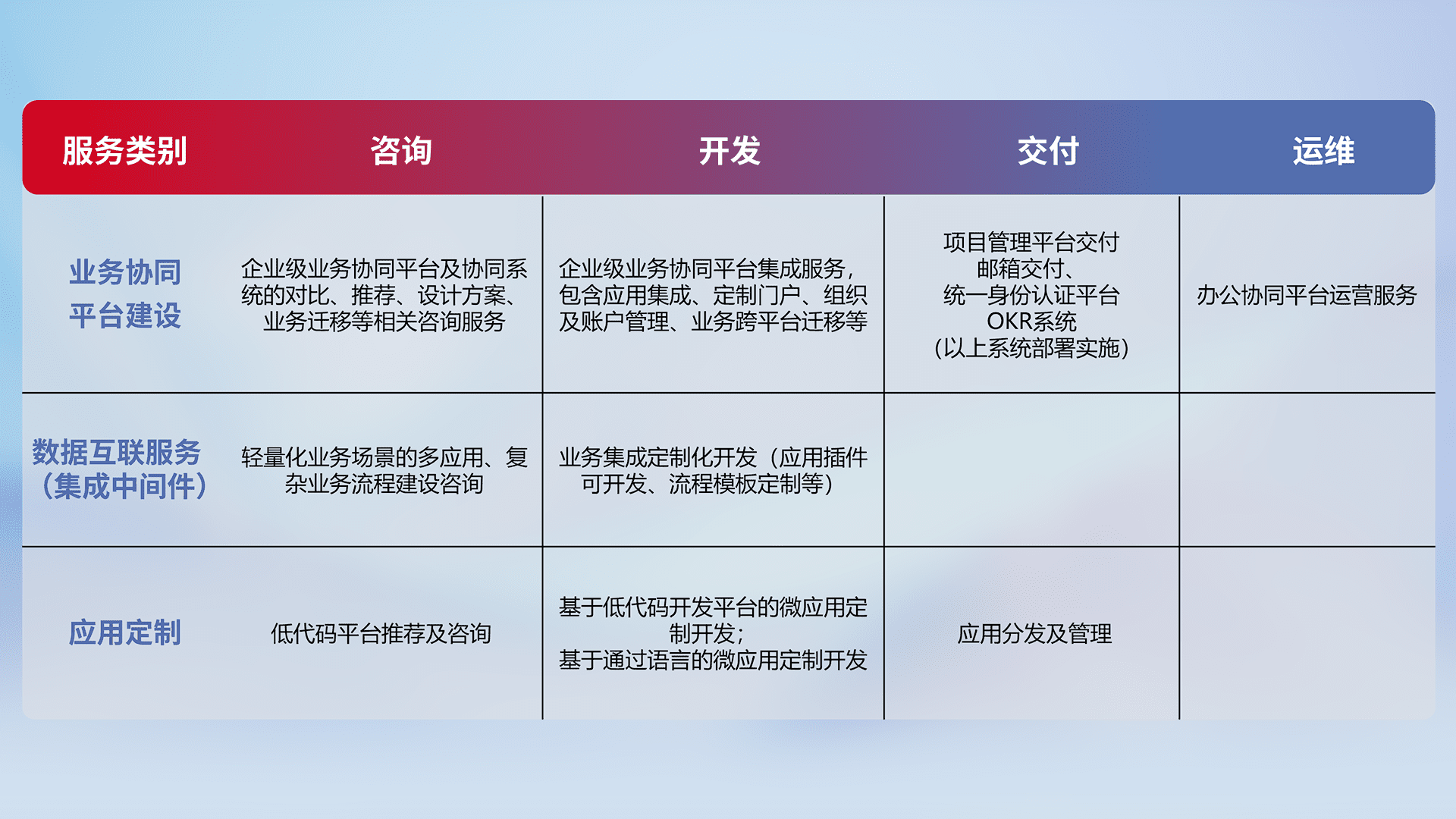针对钉钉、、、、企微、、、IDaas等平台级产品提供产品的规划、、方案、、、交付、、、定制化开发等服务,,实现如统一协同办公、、智能客户服务、、、、混合会议管理、、、智能数据查询、、等业务场景,,实现数字化转型。。。。